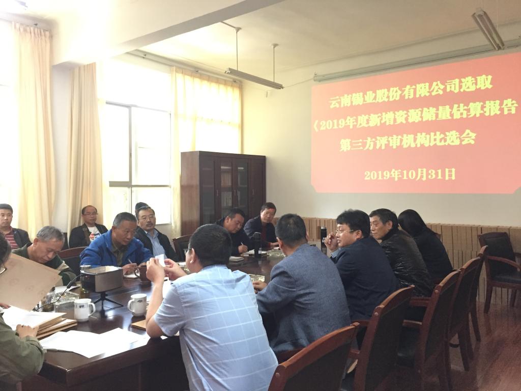 10月31日,錫業股份公司《2019年度新增資源儲量估算報告》第三方評審機構比選會在紅河資源公司召開??毓晒镜販y專業委、紅河資源公司相關部門負責人,錫業股份監察審計部相關人員,老廠分公司、大屯錫礦、卡房分公司技術負責人及分管領導,4個投標單位參加比選會。