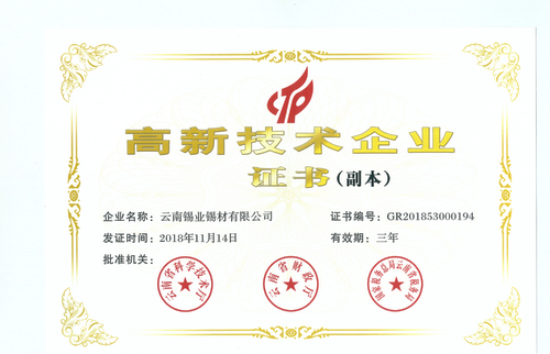 2018年,錫材公司經過評審、公示,再次獲得認定,取得“高新技術企業證書”。自2009年錫材公司首次申報高新技術企業并獲得認定開始,已連續四次申報成功,一共連續12年位居高新技術企業之列。