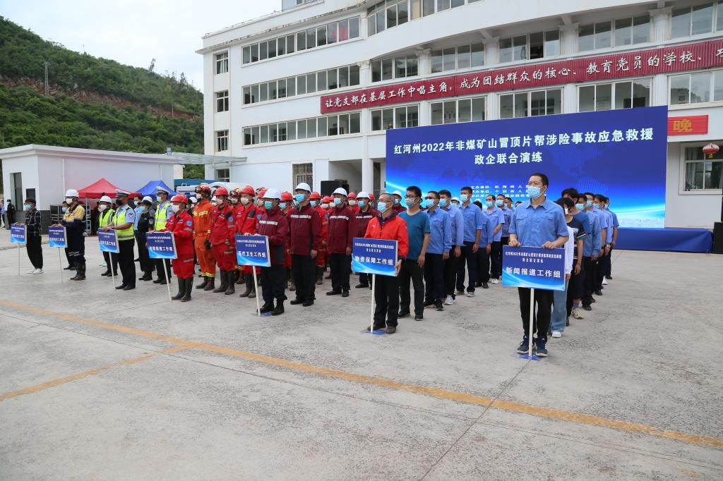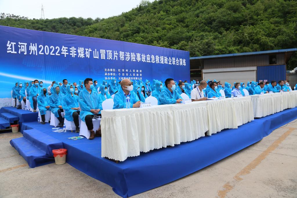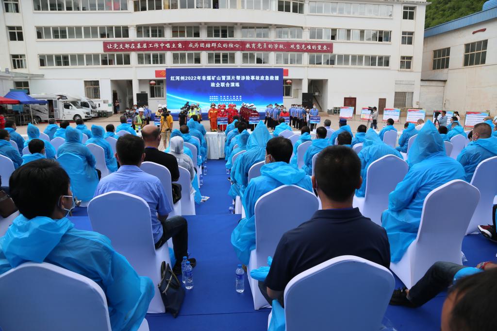 6月23日,由紅河州人民政府主辦、個舊市人民政府承辦、云南錫業股份有限公司協辦的紅河州2022年非煤礦山冒頂片幫涉險事故應急救援政企聯合演練在大屯錫礦舉行。認真學習貫徹落實習近平總書記關于安全生產重要論述,推動各級應急管理責任落實,壓實安全生產責任,切實提高紅河州非煤礦山事故應急救援能力。紅河州人民政府副秘書長楊克平,紅河州應急管理局局長張錳,錫業股份黨委副書記、董事長、總經理劉路坷,錫業股份黨委委員、副總經理王建偉,錫業股份黨委委員、大屯錫礦黨委書記、經理王壽安等出席演練活動。