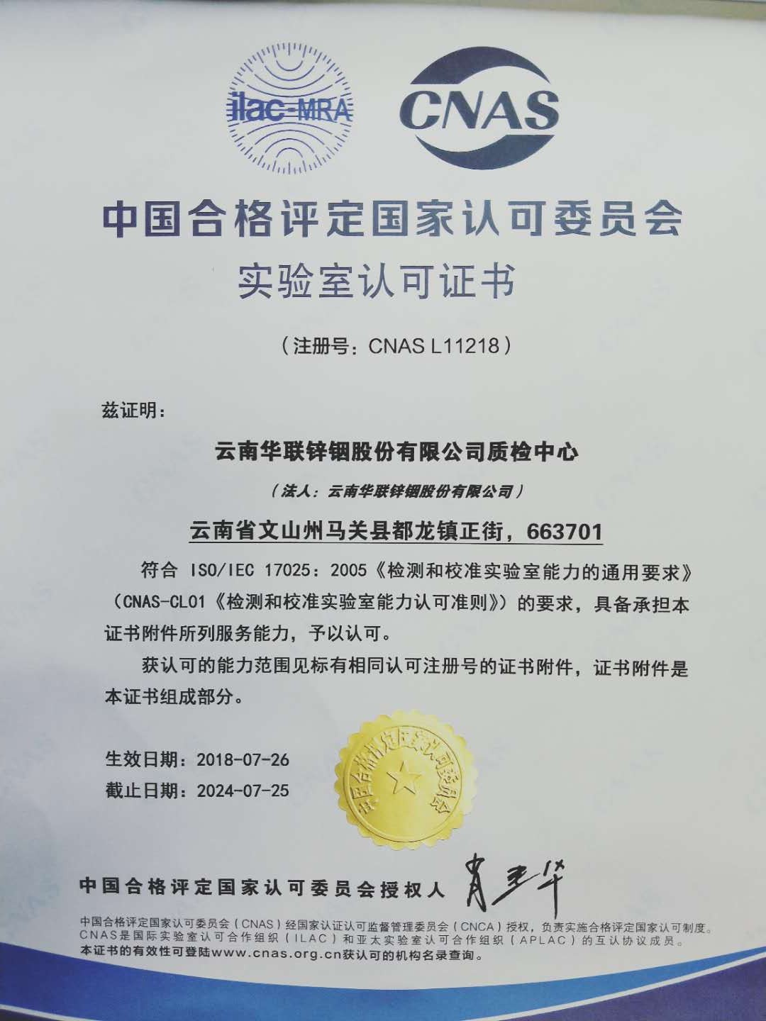 8月3日,華聯鋅銦公司通過CNAS實驗室現場評審和后續審查,成功獲得實驗室國家認可證書。