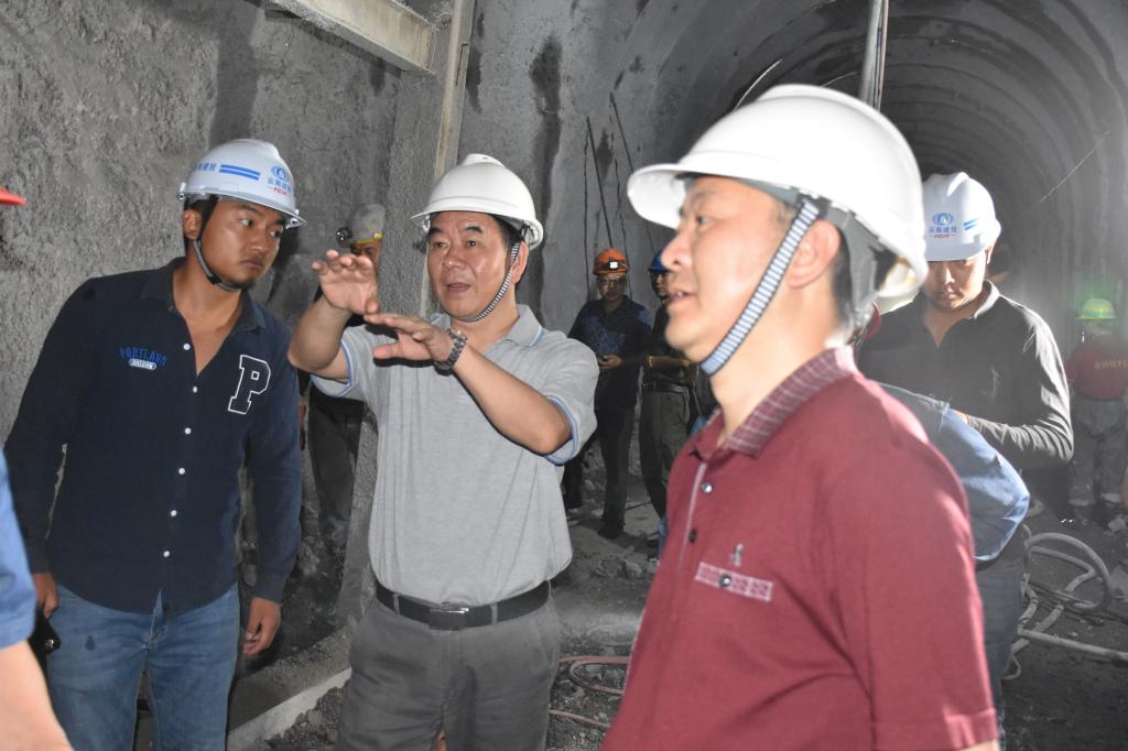 湯發在象沖尾礦庫項目建設現場指揮部,聽取庫區項目施工、建設情況匯報,了解庫區施工流程、滑坡體治理、項目征地等建設重點、難點問題后,深入到庫區施工現場,詳細了解排洪隧洞、排水井架、截水溝砌筑、擋水壩、邊坡開挖立方量、尾礦輸送管線等庫區建設子項目推進情況。