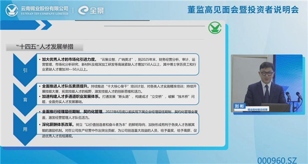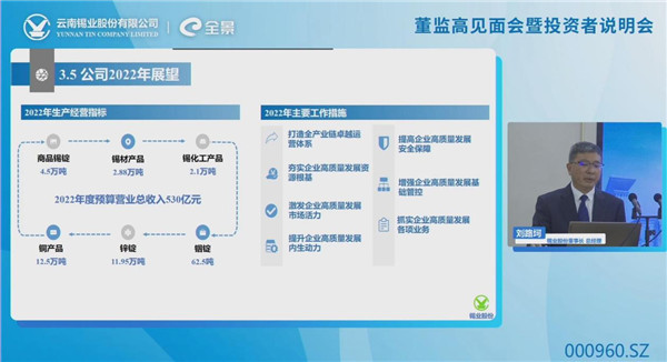 董事長(zhǎng)、總經(jīng)理劉路坷介紹了公司資源、業(yè)務(wù)產(chǎn)業(yè)鏈、產(chǎn)品及近期生產(chǎn)經(jīng)營(yíng)情況,同時(shí)充分闡述了公司未來(lái)發(fā)展戰(zhàn)略,即圍繞著打造全球錫、銦全產(chǎn)業(yè)鏈供應(yīng)鏈“鏈主”的發(fā)展愿景,以“綠色智能補(bǔ)鏈、精深加工延鏈、改革創(chuàng)新強(qiáng)鏈”為發(fā)展理念,圍繞資源拓展、現(xiàn)代礦山、原材料制造、新材料和精深加工、供應(yīng)鏈五個(gè)業(yè)務(wù)單元布局有色金屬全產(chǎn)業(yè)鏈,助推上市公司高質(zhì)量發(fā)展。