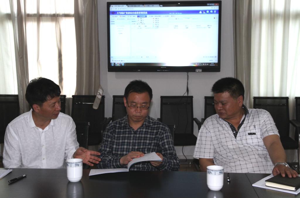 “目前有多少黨員?‘三會(huì)一課’制度是否按要求執(zhí)行?黨員對(duì)一系列黨建工作是什么態(tài)度?”姚家立在檢查三坑黨總支黨員活動(dòng)室建設(shè)工作時(shí),詢問了黨建工作相關(guān)情況。三坑黨總支書記逐一回答了姚副書記的提問,并就所開展的黨建工作情況作了匯報(bào),其中,組織黨員觀看央視專題片《榜樣》,開展“看榜樣、學(xué)榜樣、爭(zhēng)做榜樣”活動(dòng);設(shè)立坑下黨員活動(dòng)陣地,結(jié)合安全工作推行現(xiàn)場(chǎng)標(biāo)準(zhǔn)化定置管理等特色實(shí)踐活動(dòng)。三坑坑長(zhǎng)對(duì)坑口人力資源配置、今年以來(lái)的生產(chǎn)組織情況作了匯報(bào)。組織人力資源部門介紹并演示了正在測(cè)試的大屯錫礦黨建綜合信息管理系統(tǒng),該系統(tǒng)分為組織管理、黨員管理、干部人才管理、工作任務(wù)管理和學(xué)習(xí)交流五大模塊,具備權(quán)限分級(jí)、保密性強(qiáng)、覆蓋面廣和兼有互動(dòng)等特點(diǎn),通過(guò)系統(tǒng)建設(shè)與管理,可實(shí)現(xiàn)基層黨建“標(biāo)準(zhǔn)化建設(shè)、程序化控制、痕跡化管理、常態(tài)化考核、持續(xù)化改進(jìn),特色化發(fā)展”。
