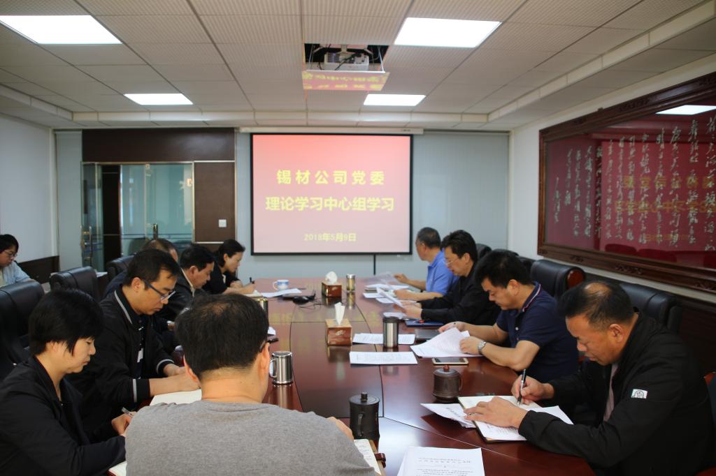 5月9日,錫材公司黨委理論學(xué)習(xí)中心組舉行第二次集中學(xué)習(xí)研討,深入學(xué)習(xí)貫徹習(xí)近平新時代中國特色社會主義思想,進(jìn)一步統(tǒng)一思想、凝聚共識,用理論武裝頭腦、指導(dǎo)實踐,確保全年生產(chǎn)經(jīng)營和深改攻堅目標(biāo)任務(wù)完成。